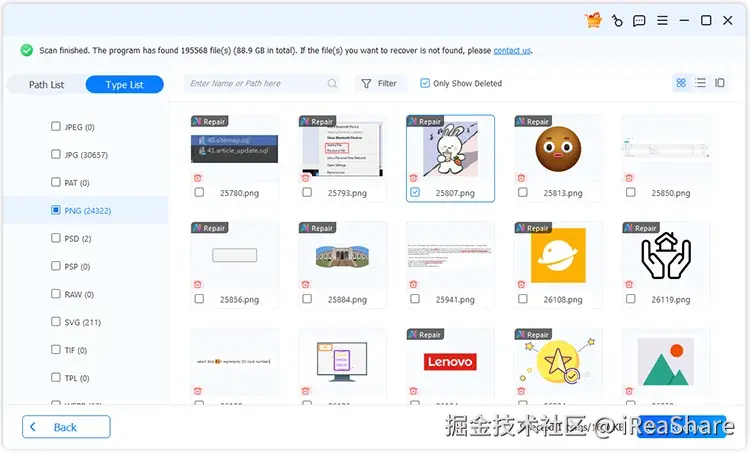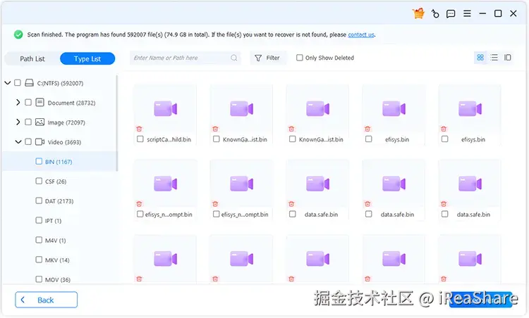 步骤 4: 扫描完成后,您可以在界面上预览已删除的文件和现有的文件。您可以打开“仅显示已删除”以仅查看已删除的文件。然后选择您的目标文件,然后单击“全部恢复”。