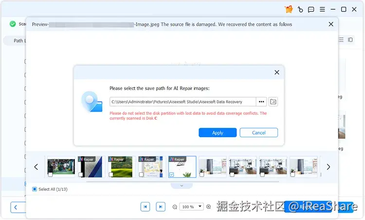 步骤 4: 选择保存修复后的照片的文件夹,然后单击“应用”。