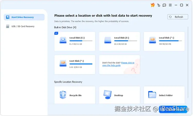 步骤 3: 点击“硬盘恢复”并选择本地磁盘。然后单击“开始扫描”。该软件将开始扫描所选磁盘并检索丢失的数据。