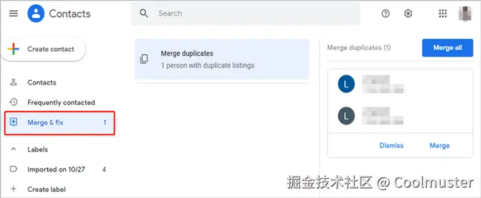 步骤4. 单击左侧的“合并并修复”,程序将在所有 Google 联系人中搜索重复项,包括从 iCloud 导入的联系人。