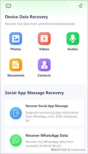 如果您想要一款业内恢复率最高的Android版照片和视频恢复应用, Coolmuster Lab.Fone for Android就是您的理想之选。它拥有众多先进且强大的功能,可确保您恢复任何已删除的照片,无论是 SD 卡还是内存中的照片。该工具支持恢复联系人、文档、消息等。