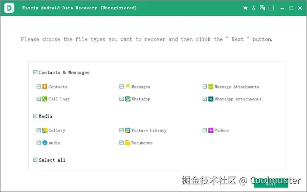 02连接成功后,您将看到以下界面,其中显示了所有可供恢复的数据类别。在这里,选择 “照片” ,然后单击 “下一步” 。