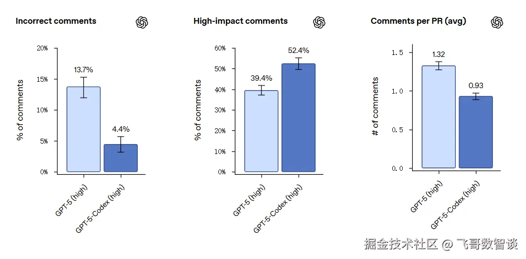 GPT-5-Codex 经过了专门的代码审查训练,可深度理解 PR,分析依赖,在一些开源项目的最新 PR 中评估结果如下: