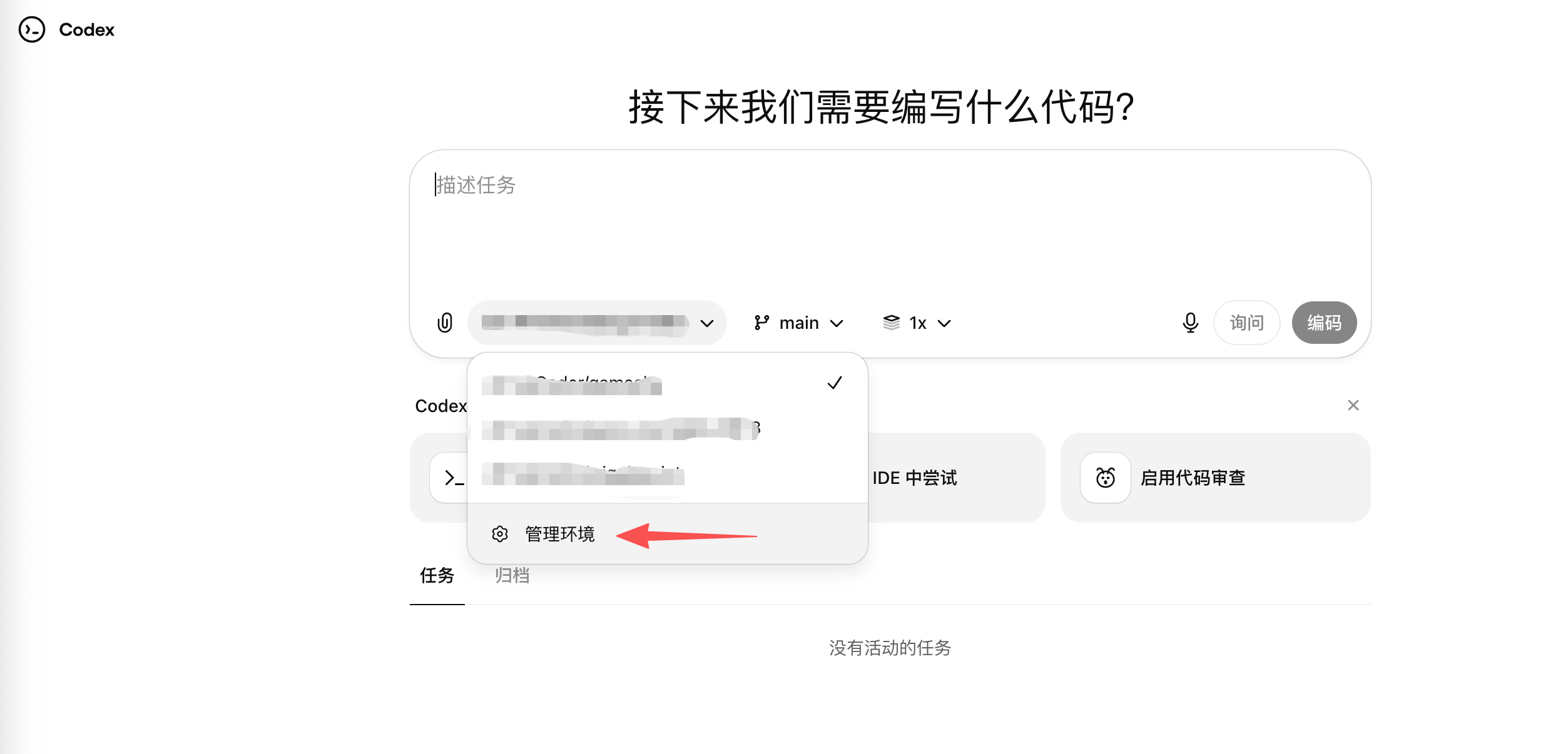 然后选择管理环境(因为我已经关联了 GitHub ,所以这里没有关联的流程):