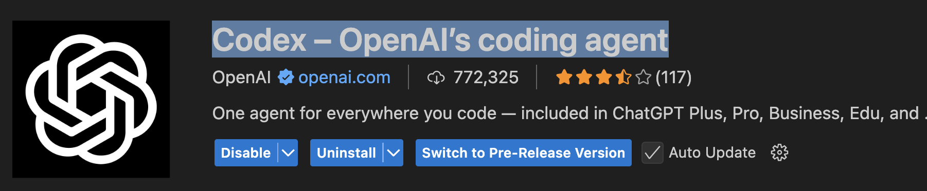 这里需要注意的是,插件商店中,Codex 的插件名称是 Codex – OpenAI’s coding agent,直接搜 Codex 可能搜不到。