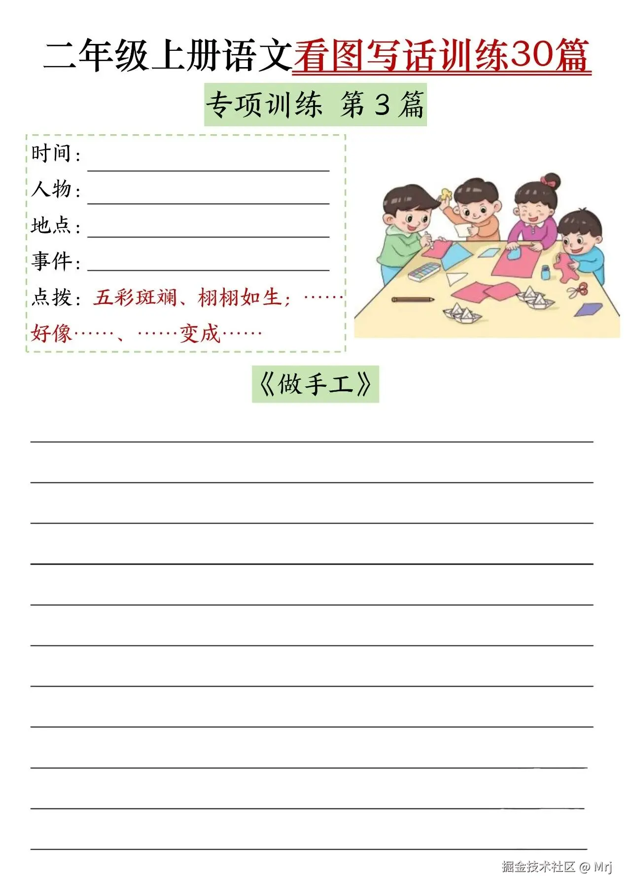 二上语文看图写话训练30篇(含范文60页 Mrj 2025-09-17 53 阅读1分钟 二上语文看图写话训练30篇(含范文60页) (温馨提示:文末有完整电子版领取方式) 二上语文看图写话训练30篇(含范文60页) 链接:pan.quark.cn/s/95cbceb1d…