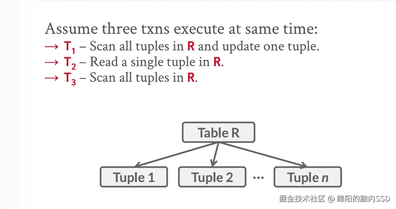- 首先T1想要读取R表, 并且修改某一个元组。 所以他要在R表上加一个共享意向排他锁, 然后给其中的tupleN加写锁, 其他加读锁。