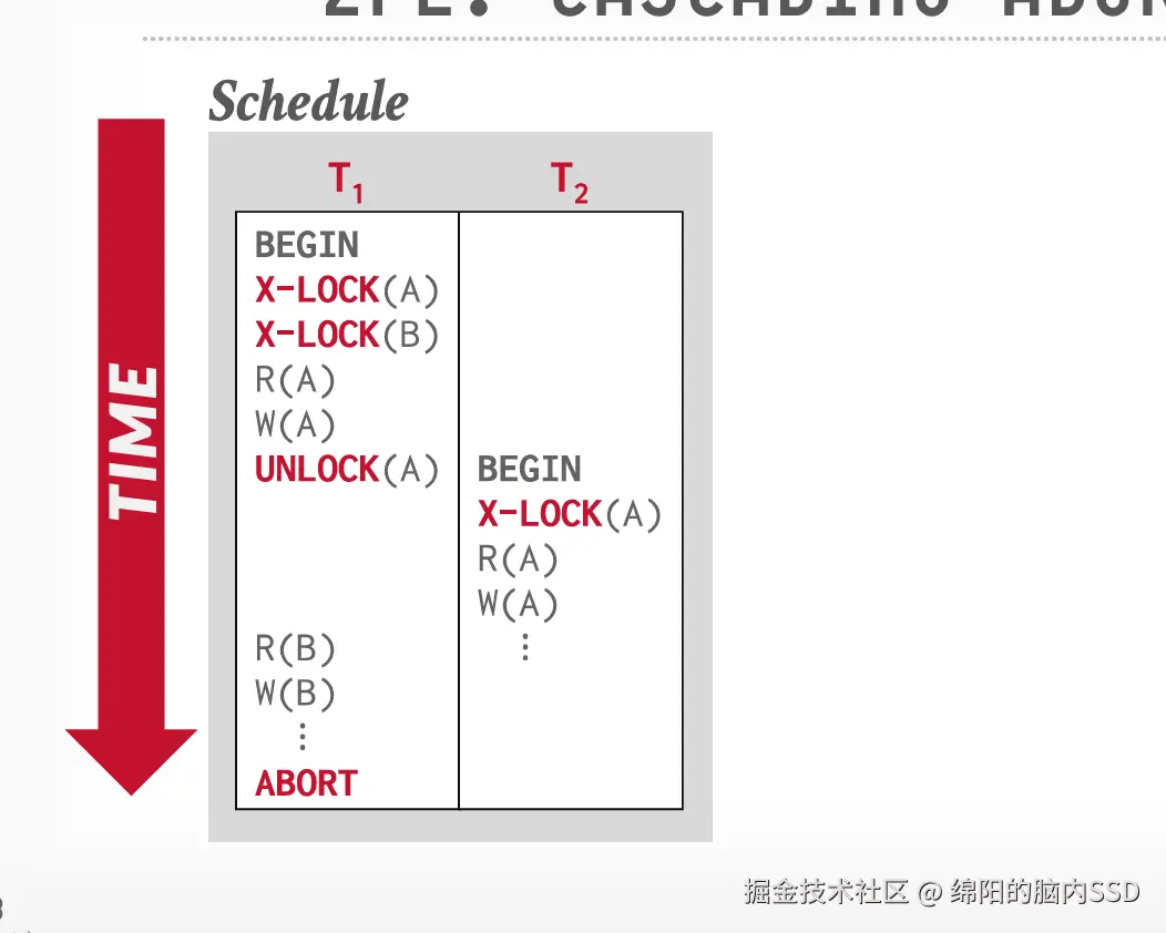 但是两阶段锁需要进行级联中止防止出现问题, 级联中止即一个事务回滚, 连带着另一些事务也一起回滚。 这个的原因是因为出现下面一种情况: