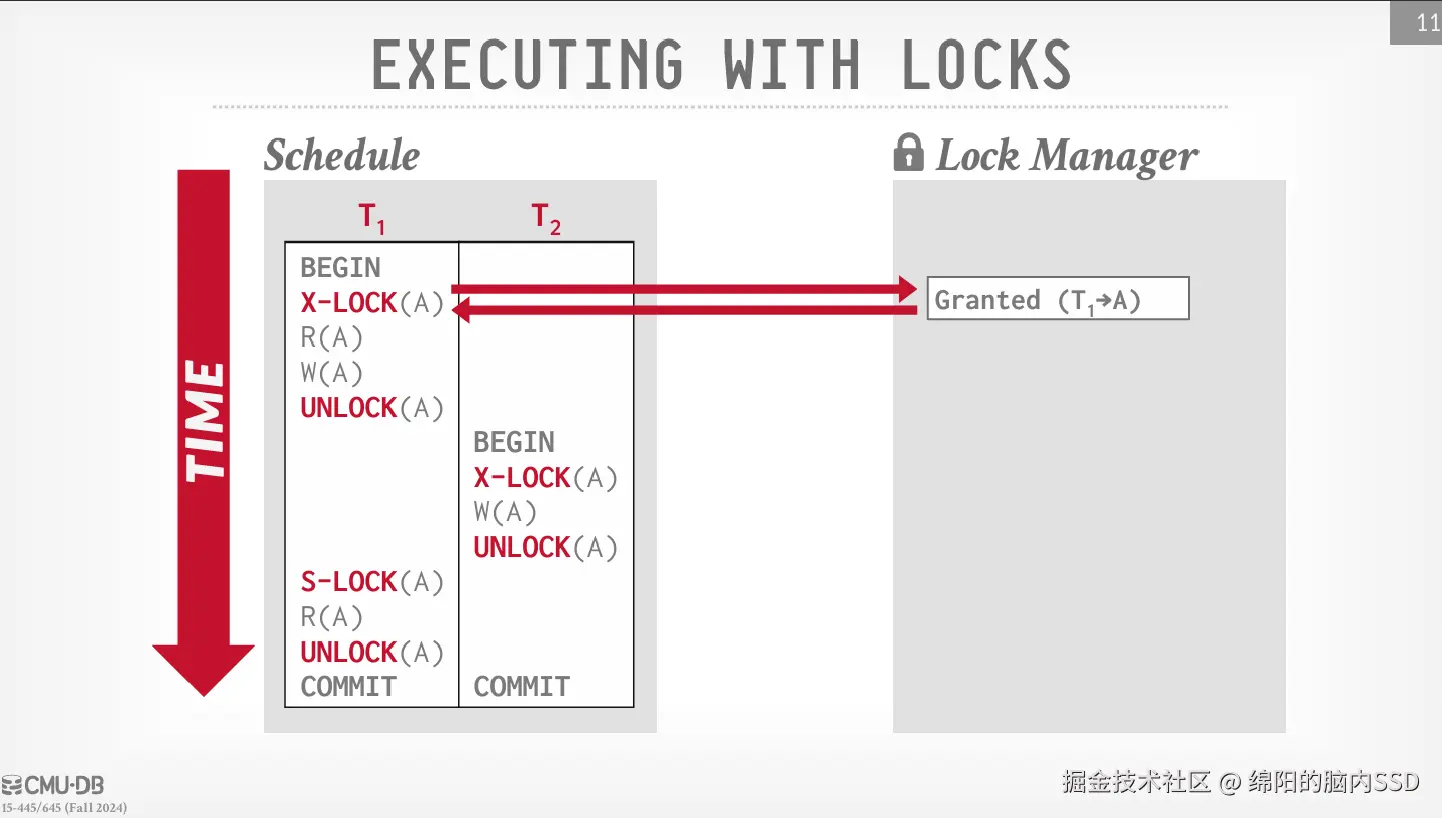 在事务中经常使用一个全局的锁管理器来管理所有资源的锁。 如果一个事务想要访问某个资源, 不再向资源发起请求锁, 而是直接向锁管理器发起锁申请。 如果锁已经被占用, 锁管理器会将这个事务加入到这个锁的等待队列当中, 只有当这个事务是等待队列的队头,并且锁没有被占用时,才能被唤醒。 最后就是锁管理器由于会被多个事务同时访问, 所以锁管理器自身要有锁存器, 事务访问锁管理器,先获取锁存器, 再申请资源锁。