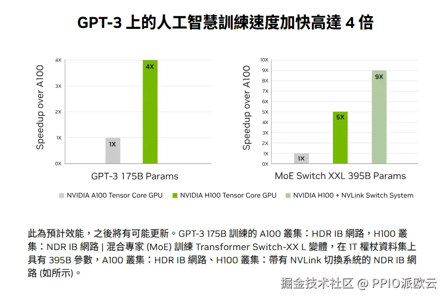 正是得益于 Transformer Engine,H100在训练大型语言模型时,结合NVLink Switch System,相比A100能够实现高达9倍的性能飞跃