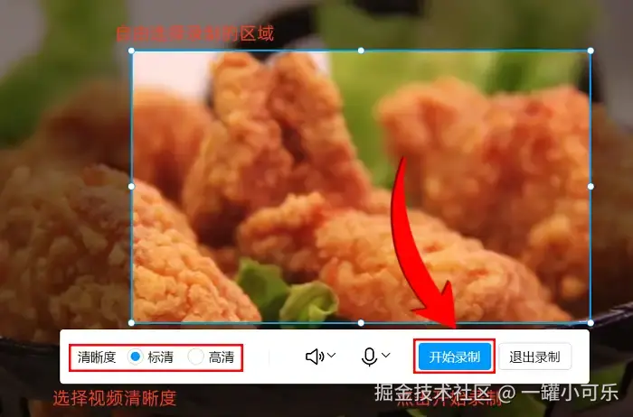 步骤2:接着自由选择需要录制的区域,还可以调整画面的清晰度,弄好之后点击 “开始录制” 就行。
