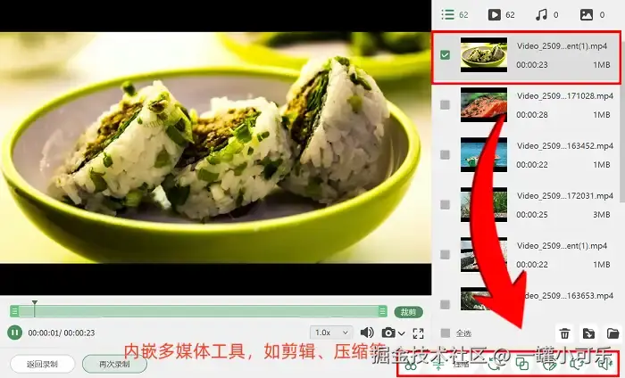 步骤3:录完之后不用找文件,软件会直接跳转到 “预览页面” ,刚录的视频立马能看——有没有漏录、声音清不清晰,一眼就知道。要是觉得视频还差点意思,可以点击 “高级剪辑” ,进入后期编辑功能。在这里你可以把长视频切成几段,或者加个转场特效。