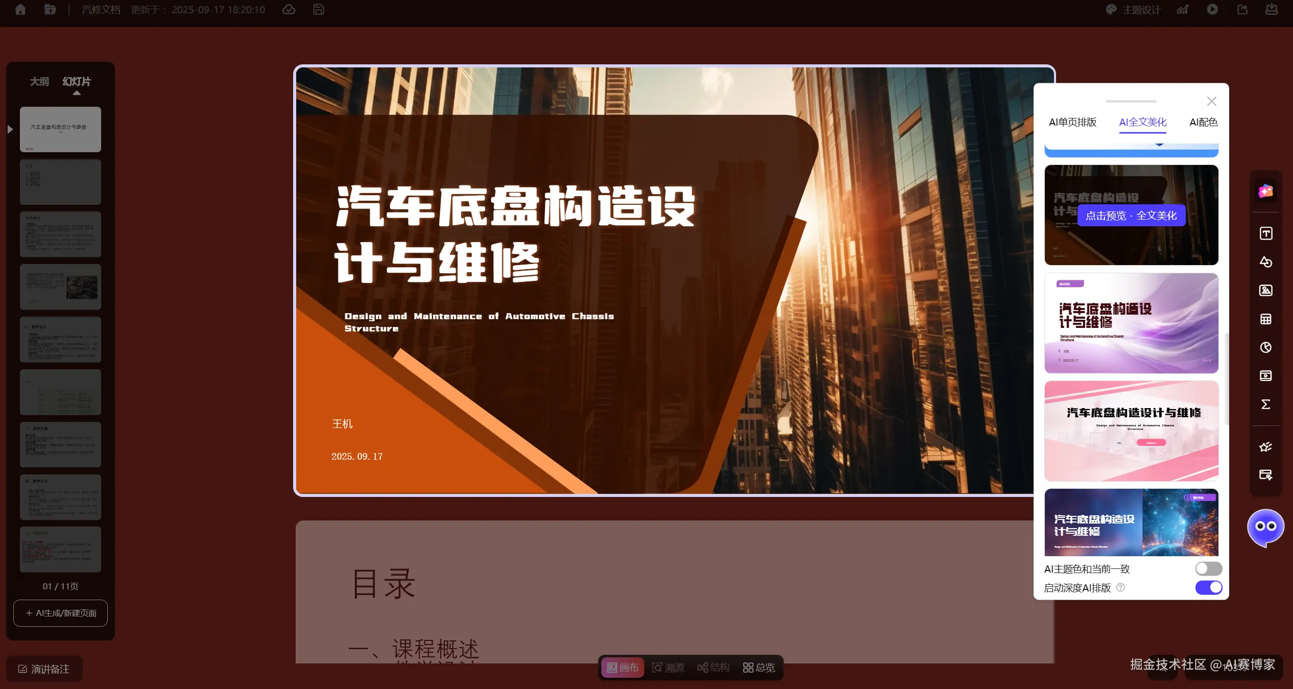- 全文美化可以支持"选择是否保持一致主题色、原始内容对比、单页重新美化、开启AI绘图“等细节功能,其体验都非常个性,适合于真实的美化场景。