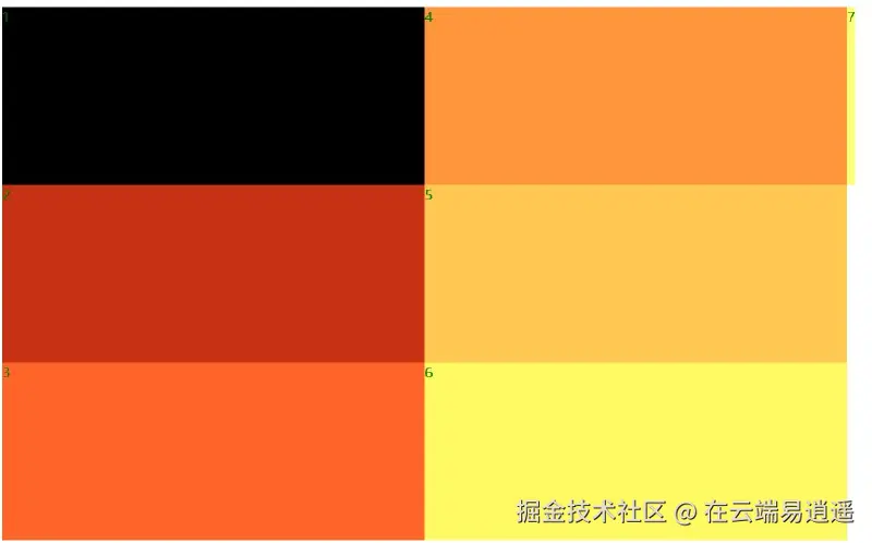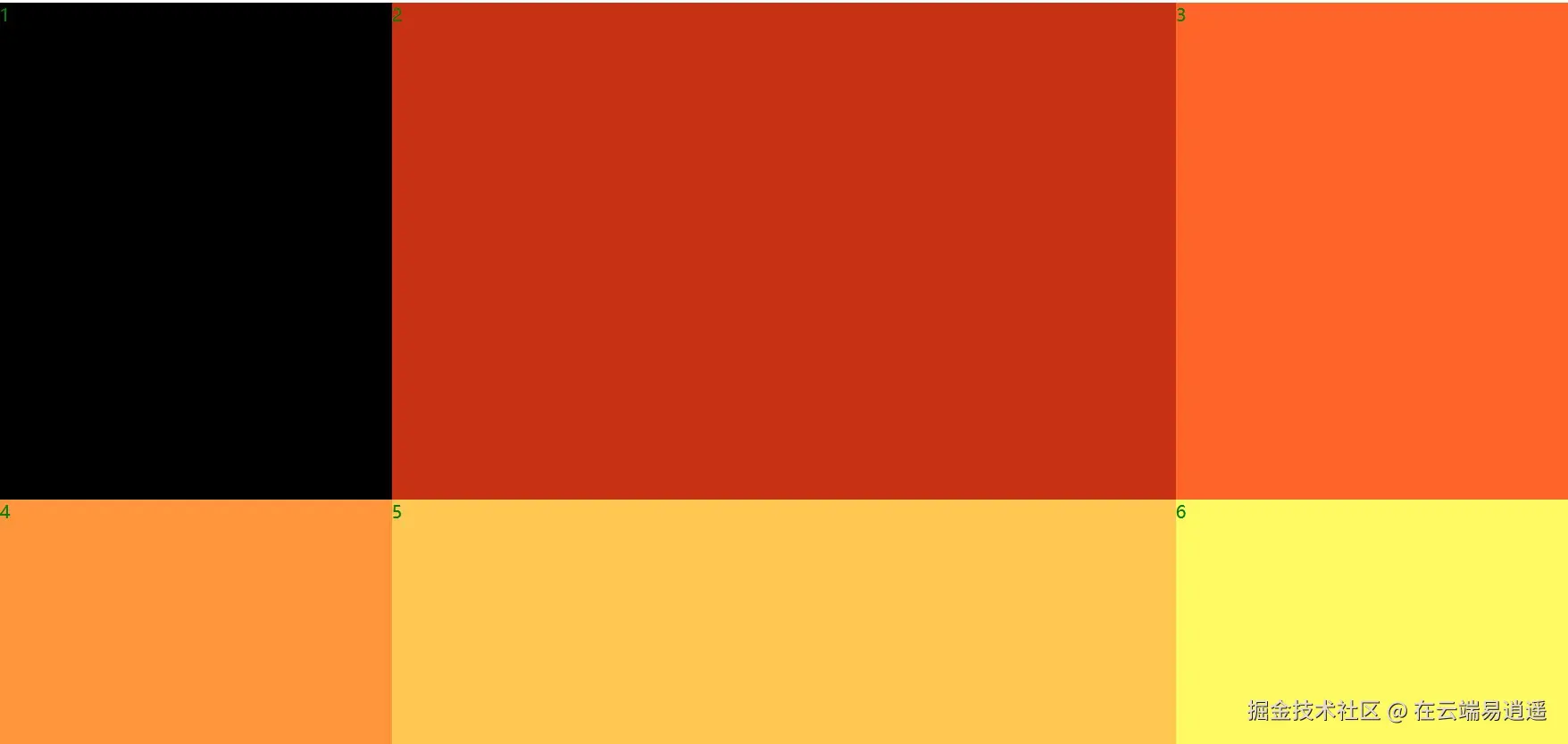 grid-auto-flow:row dense,则不会有空隙。 后面元素会“往前挤”,避免空隙 ,dense模式牺牲了“顺序”,但更节省空间。 浏览器会尝试“回头补洞”