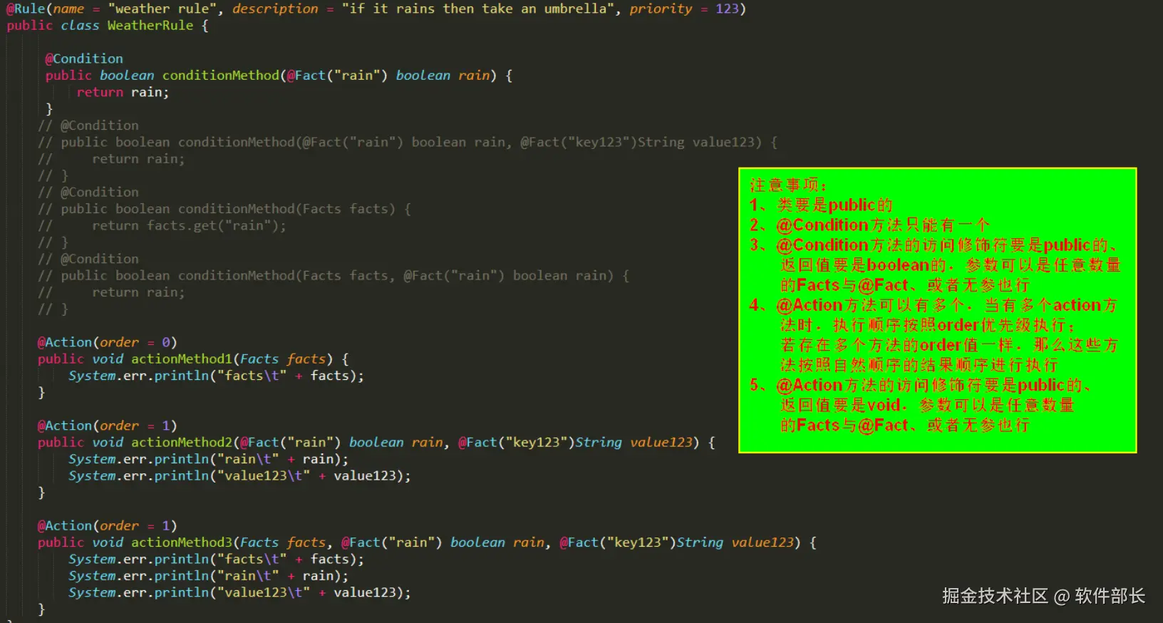 使用Easy Rules,开发人员可以通过简单的注解定义规则条件和行为,例如: