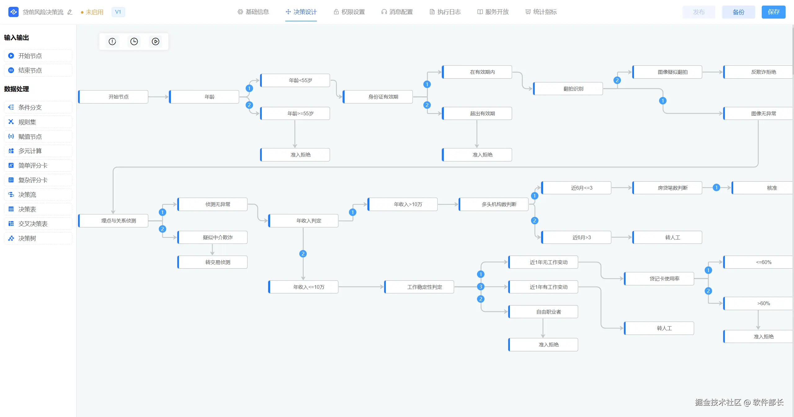 提供拖拽式配置界面,允许用户通过组件(如开始节点、判断节点、规则节点)构建决策流,支持复杂逻辑包括条件分支和循环。支持基础变量、复合变量(如数组对象)、SQL变量,并通过公式映射实现数据加工。还能无缝集成多种数据源,采用Rete算法进行优化以支持高并发和低延迟处理。