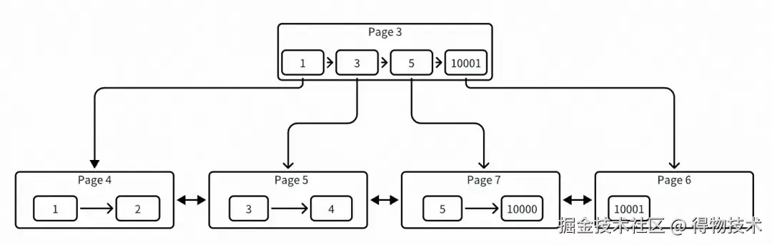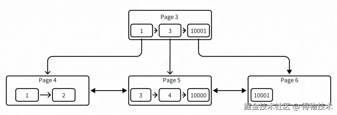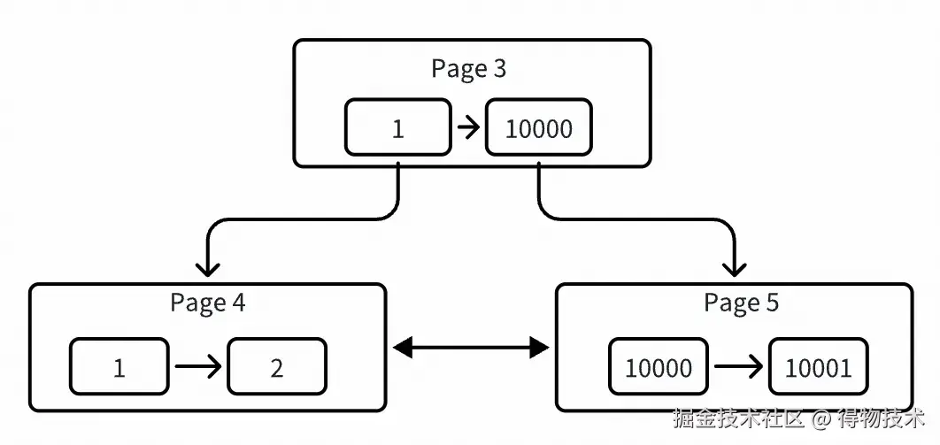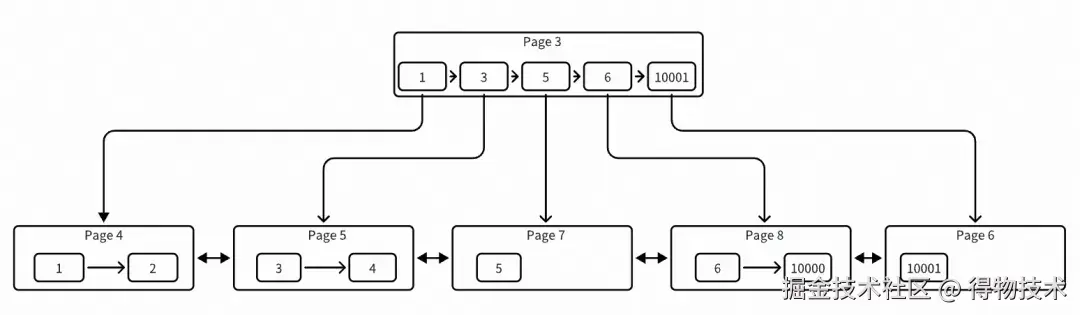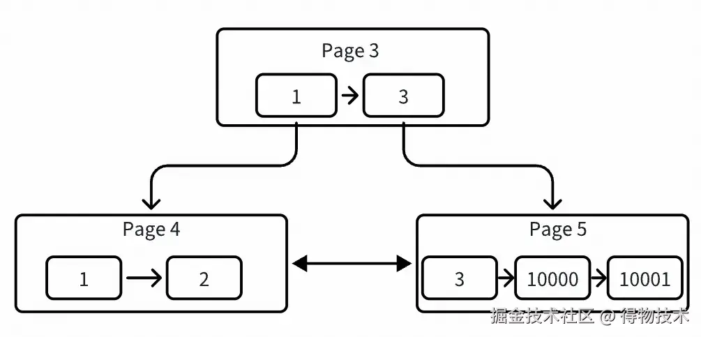 可以看到开始分裂了,page 3 被提升为根节点了,同时分裂出两个叶子节点,各自存了两条数据。此时已经形成了一棵 2 层高的树,还是用图表示吧,比较直观,如下: