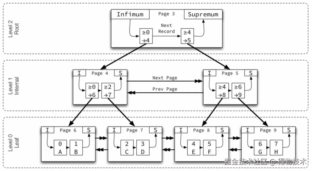 由于 InnoDB B+tree 结构高扇区特性,所以每个索引高度基本在 3-5 层之间,层级(Level)从叶子节点的 0 开始编号,沿树向上递增。每层的页面节点之间使用双向链表,前一个指针和后一个指针按key升序排列。