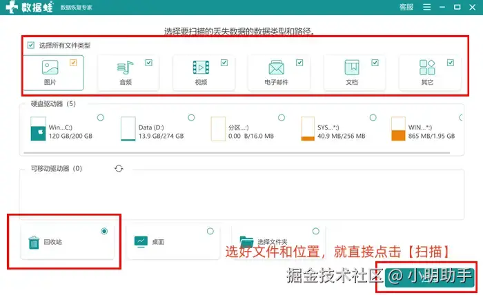步骤1: 在软件首页中根据自己的需要勾选好目标文件的类型和丢失的位置,设置完毕后点击【扫描】按钮;