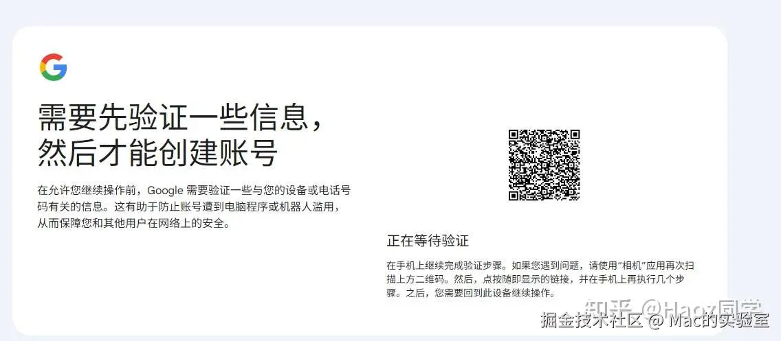 如图,如果你多次注册失败,谷歌就会出现二维码强制你扫码验证才能注册。有的伙伴第一次尝试注册就遇到这种扫码验证提示了,这是由于使用的ip环境存在风险,google认为你的注册ip不干净导致的。