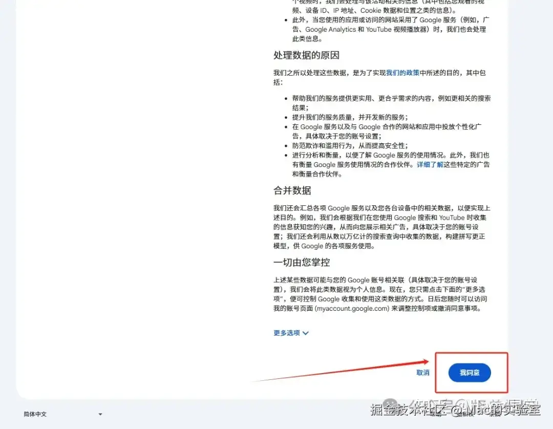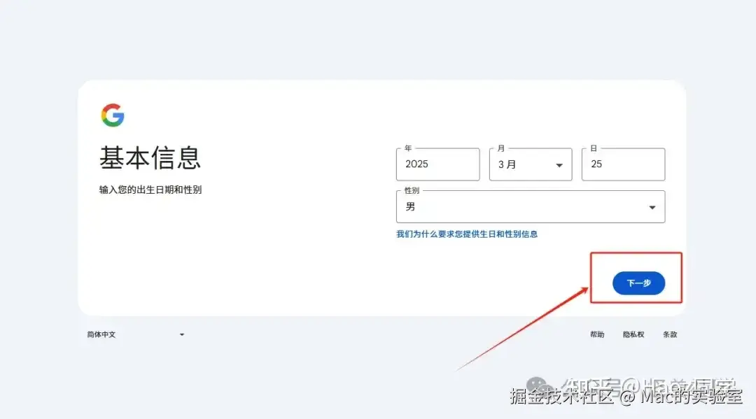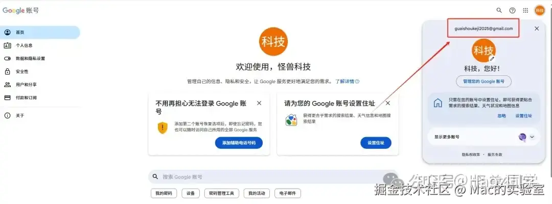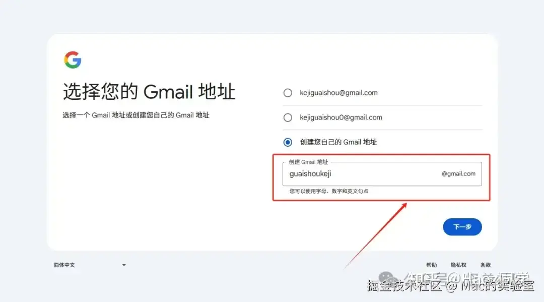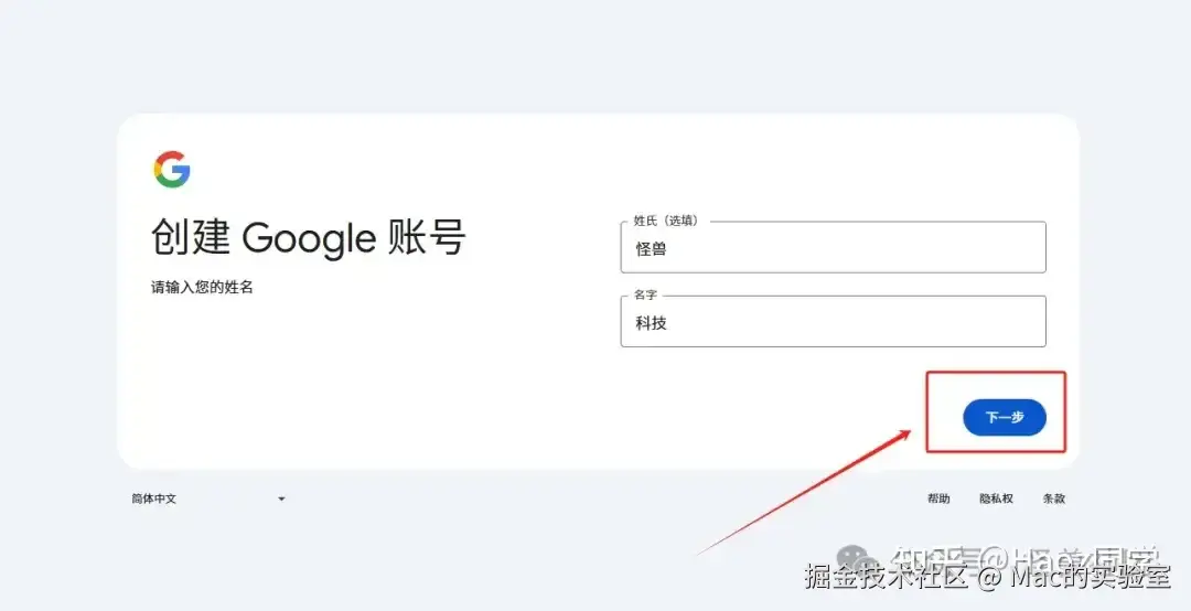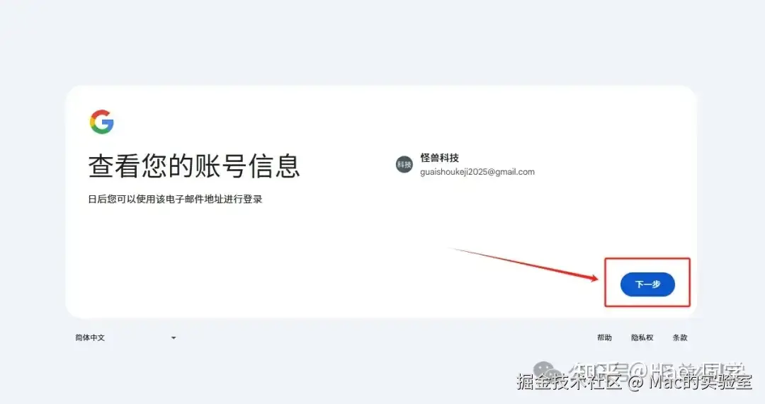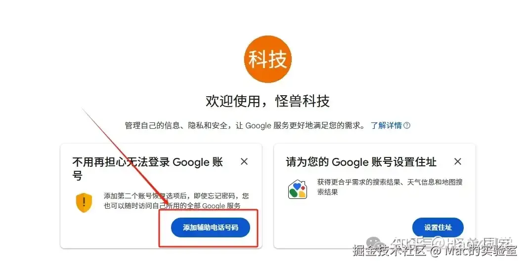 设置一下你的密码,然后点击下一步。直接跳转填辅助邮箱了,连手机号扫码验证的提示都没有,说明这是谷歌认可的注册环境。如果不行可以多试几次,折腾到没有耐心的话可以在公众号:Mac的实验室 后台回复 谷歌 几分钟就搞定了。
