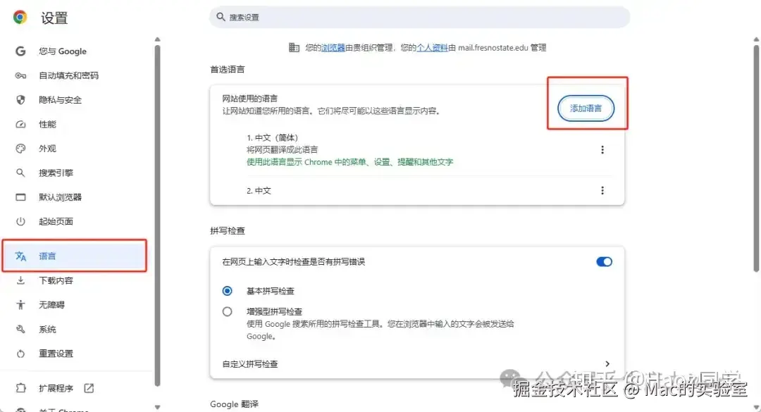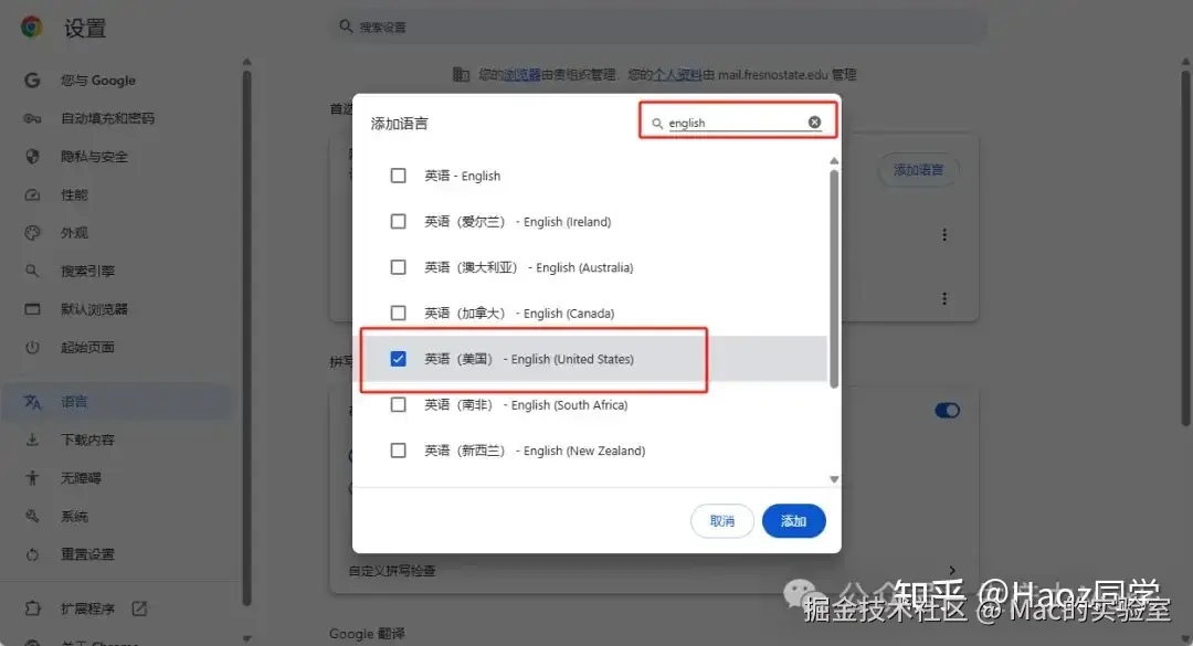 左侧菜单选 “Languages” → 点击 “Add languages” → 搜索 “English (United States)” → 添加