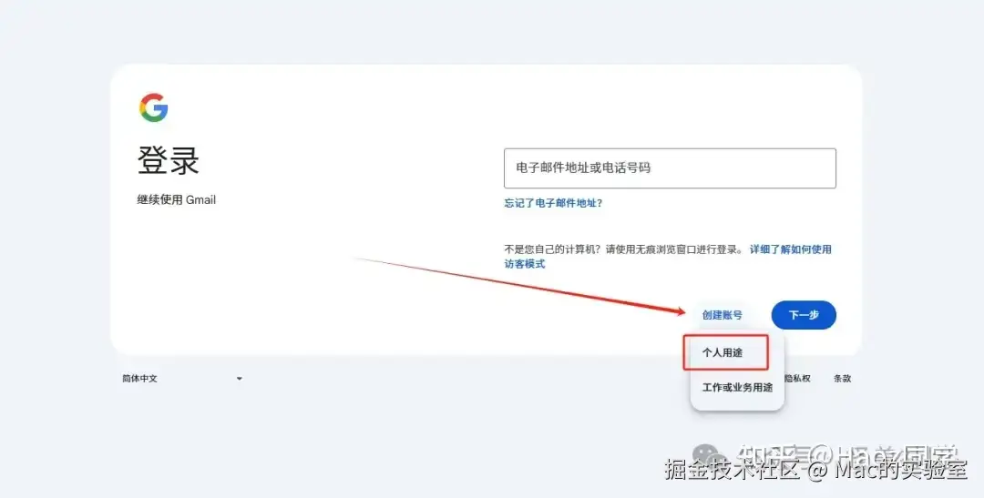 - 2 登录谷歌,选择创建账号,选择个人用途即可。