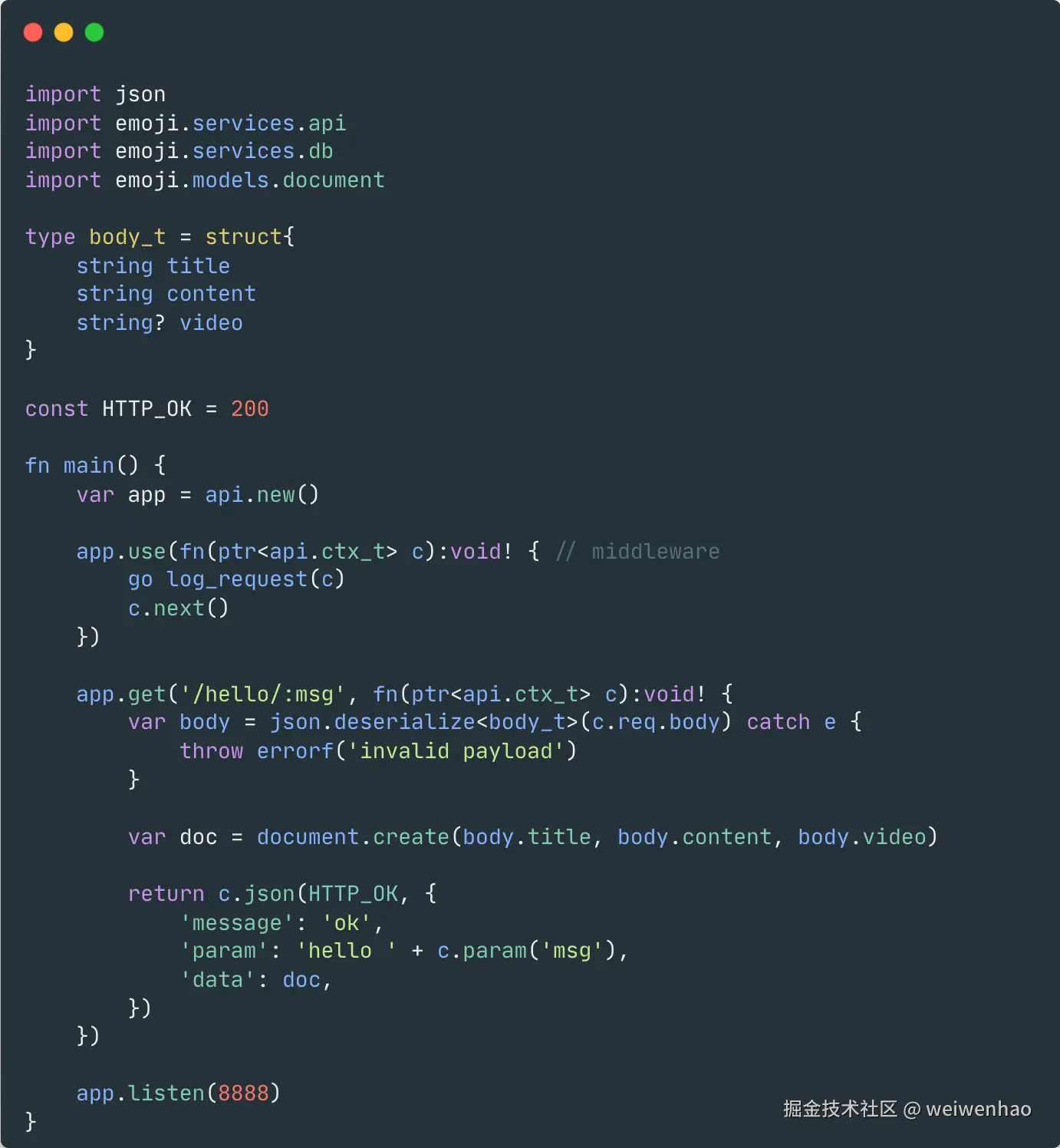 我再快速介绍一下 nature 编程语言,首先从一个由 nature 编写的 express 风格的 api 为例