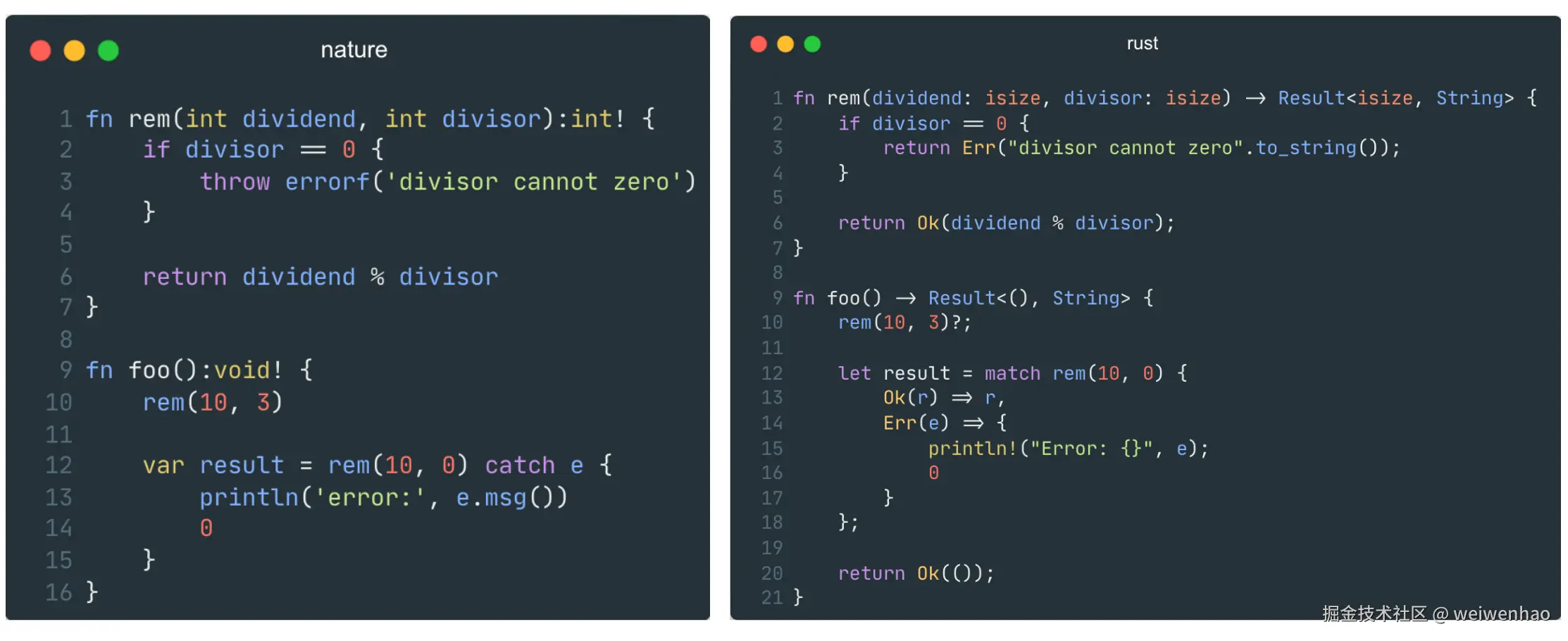 通过对比 rust,希望能让你更加清晰的了解 nature 是如何完成错误处理的。