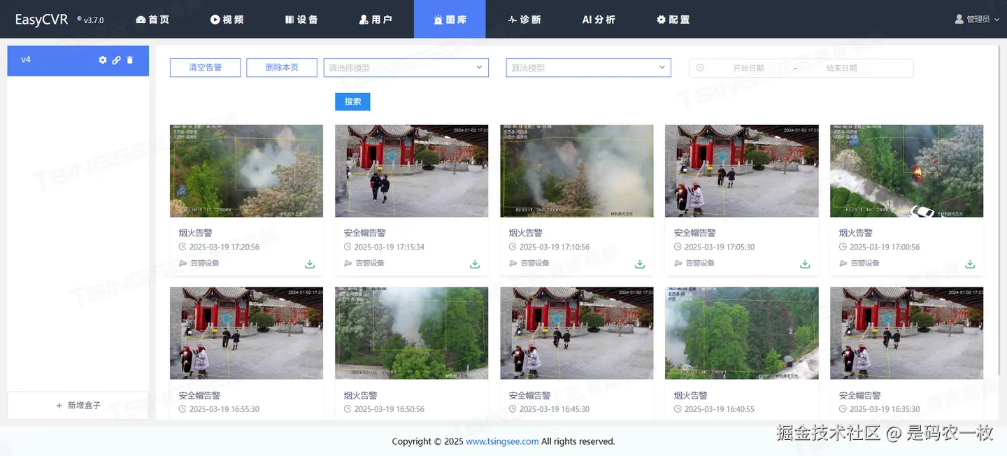 核心优势:EasyCVR提供丰富的API接口,可与各类AI算法平台(如车辆识别、安全帽检测、烟火识别等)无缝对接。平台将视频流拉取给AI分析模块,并将分析结果(如截图、结构化数据)返回,实现智能预警与事件推送。