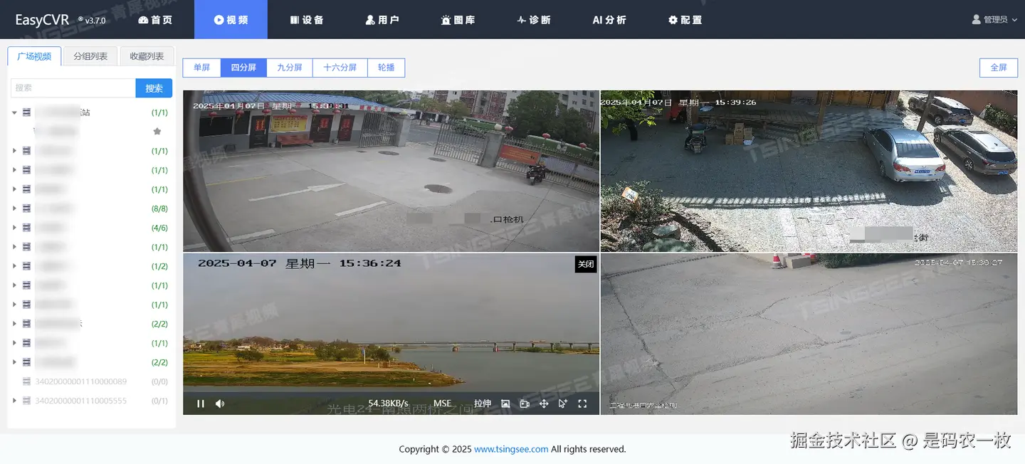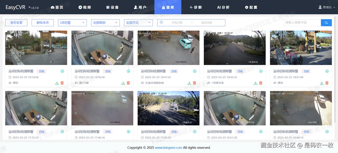 - 应用:将小区门禁、楼道、停车场、周界的监控全部接入EasyCVR平台。物业人员通过电脑或手机即可巡更;AI算法可识别区域入侵、消防通道占用等风险,并自动报警。