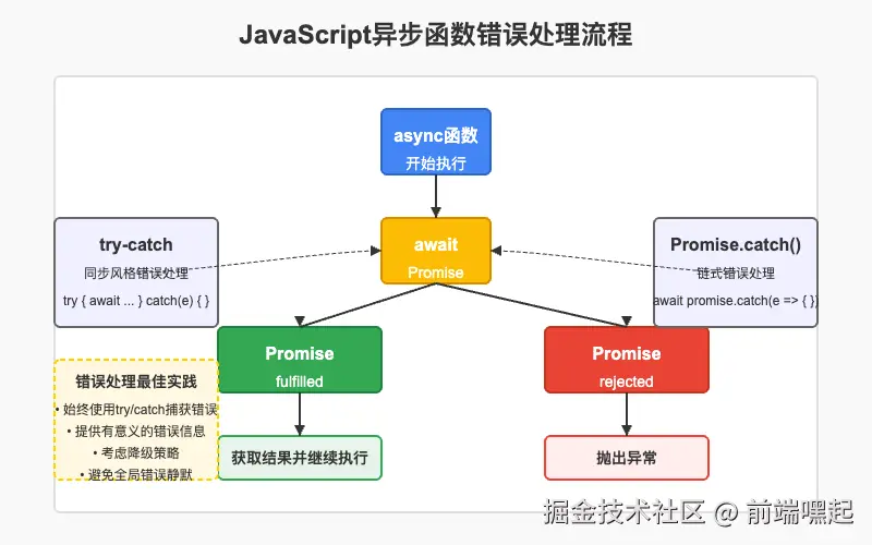 在异步函数中处理错误是非常重要的。通常有两种方式来处理async函数中的错误: