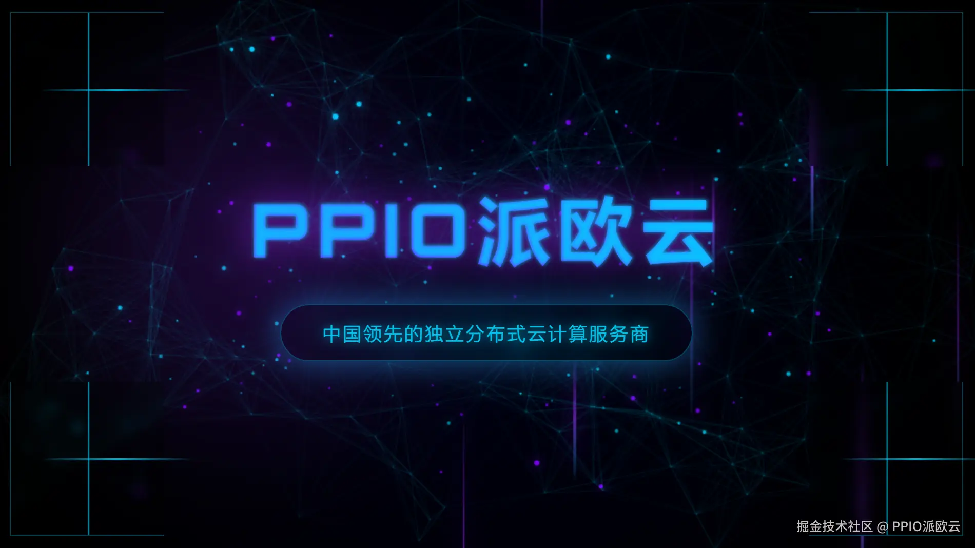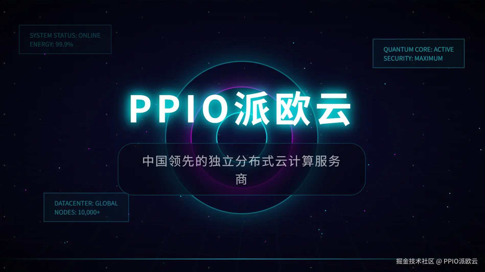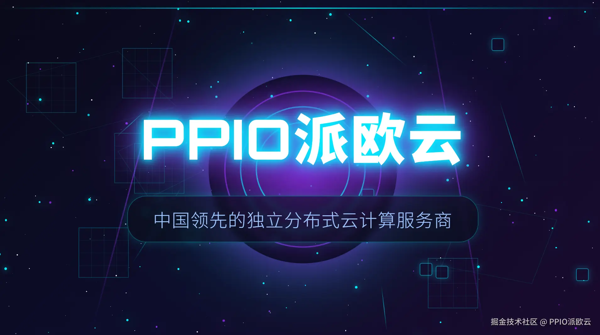 - 标题位于画面中心前景,采用未来感字体(粗体、发光描边,文字占位符:“PPIO派欧云”)。