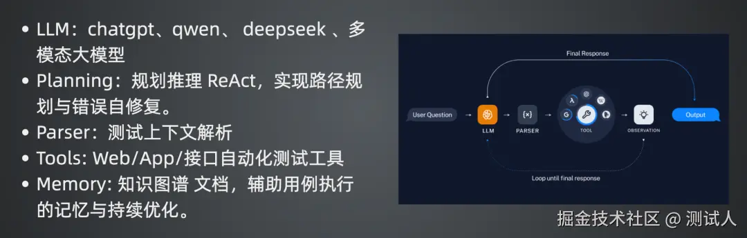 随着大模型和智能体技术的发展,测试自动化迎来了全新的可能。如果让大模型不仅具备“思考”的能力,还能像人一样去探索系统、生成用例并完成执行,那么测试团队就能从繁琐的劳动中解放出来,专注于质量把控与业务创新。