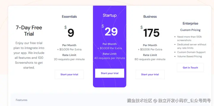 最基础的模式,也是新手最容易起步的。比如screenshotapi.net的定价:7 天免费试用,付费版分 3 档 ——9 美元 / 月(1000 次)、29 美元 / 月(1万次)、175 美元 / 月(1 万次,速率会高很多)。