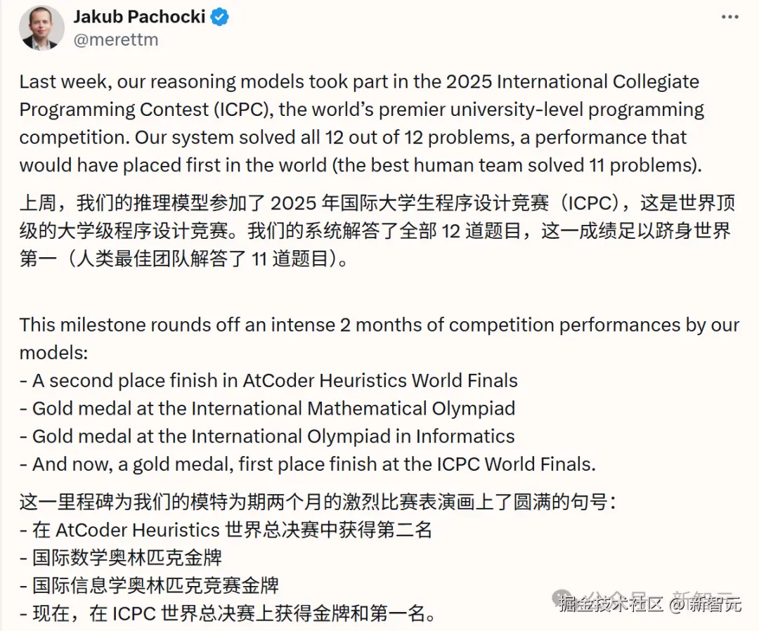 此外,OpenAI 首席科学家 Jakub Pachocki 也是 ICPC 世界金牌得主,赛后也转发了推文,对该团队的优异表现表达了热烈祝贺。