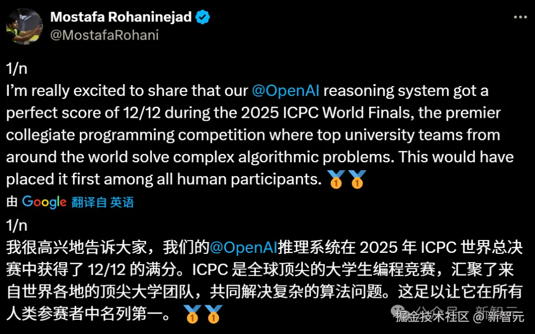 「【新智元导读】ICPC 2025 全球总决赛诞生历史性一幕:谷歌 Gemini 与 OpenAI 推理模型同时斩获金牌!Gemini 在 5 小时内攻下 12 题中的 10 题,并在 30 分钟破解难倒所有人类的死亡 C 题;而 OpenAI 更是满分 12/12,碾压 139 支人类队伍,成为赛场唯一全解团队。」