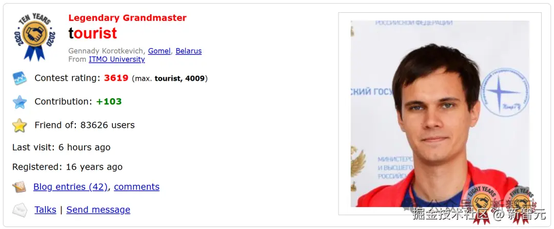 在当年的这支夺冠队伍的三人中,还有另一位更广为人知的传奇人物,那就是 tourist,算法界最强王者,世界第一人!