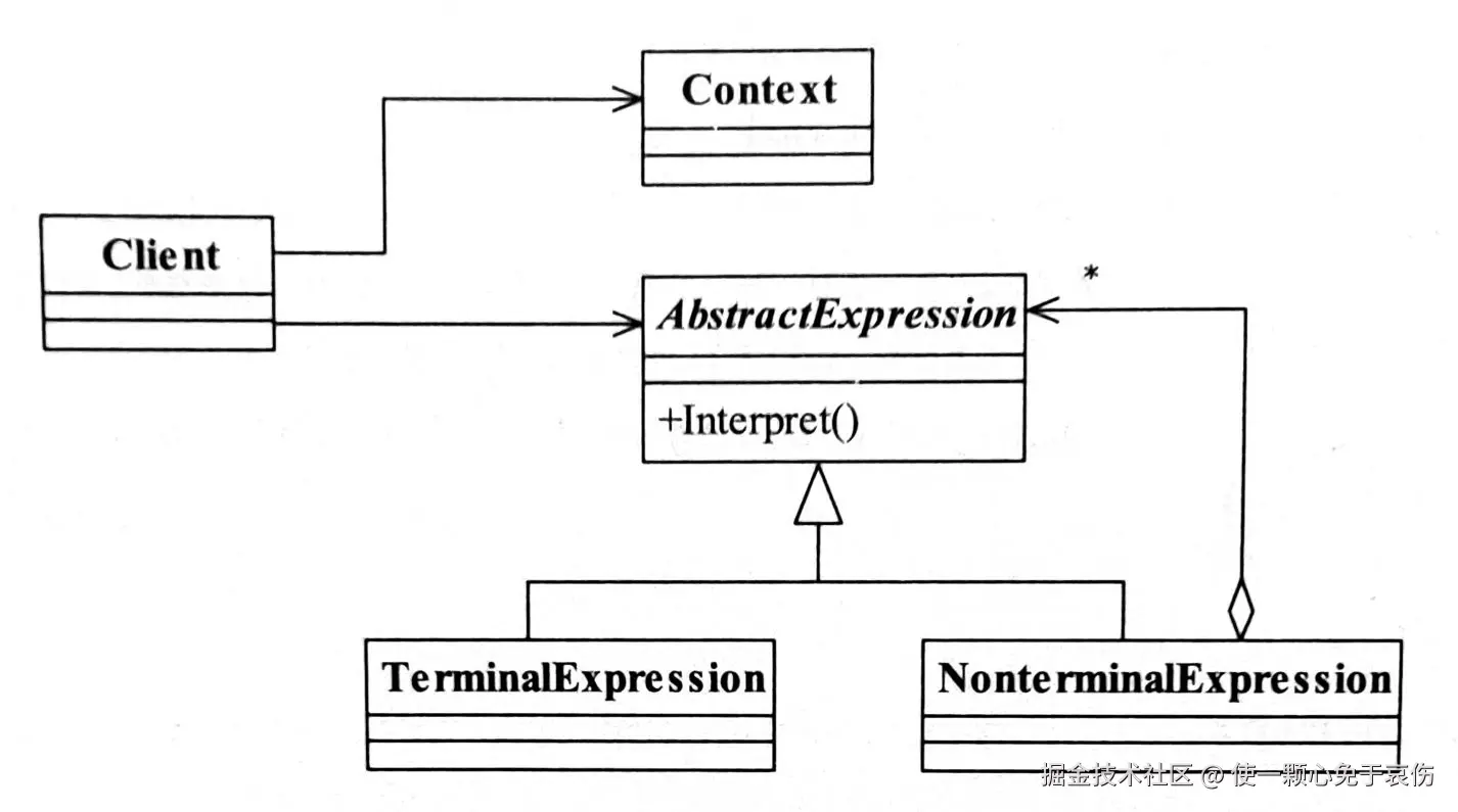 AbstractExpression,抽象解释器。具体的解释任务由各个实现类完成,具体的解释器分别由TerminalExpression和Non-terminalExpression完成。