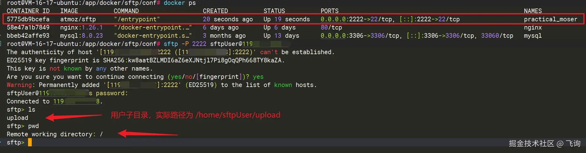 2)当使用 sftpUser 用户登录后;默认进入的目录是 /home/sftpUser;但是 atmoz/sftp 的 chroot 会把 /home/sftpUser 当作“虚拟根目录” /