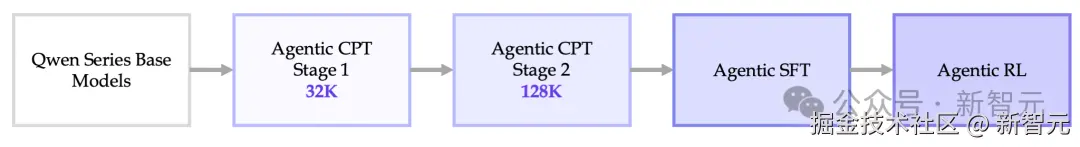 团队打通了「Agentic CPT→ SFT→ Agentic RL」端到端全链路,首次提出了两阶段的智能体增量预训练,引领了智能体训练的新范式。