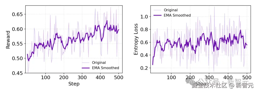 如上图动态指标显示,奖励持续震荡上升。同时,策略熵(policy entropy)保持较高水平,说明模型在持续探索进化,避免了过早收敛。