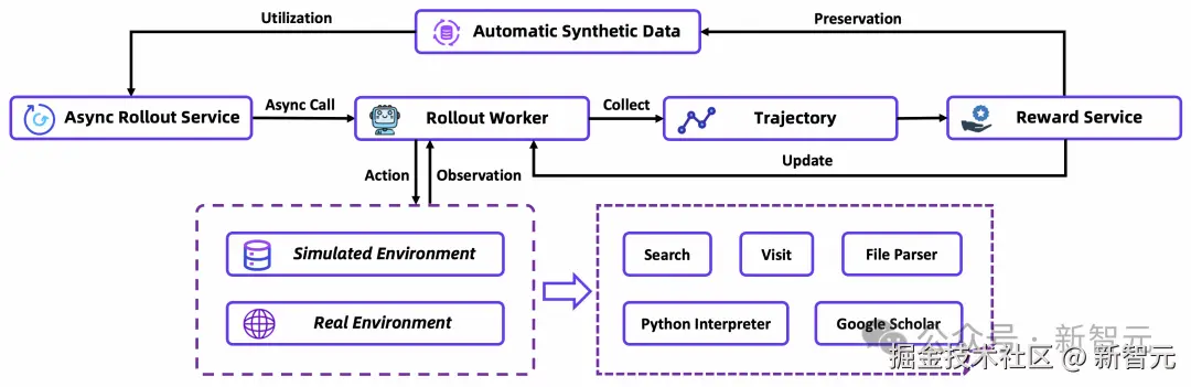 - 工具沙盒:通过缓存结果、失败重试、饱和式响应等机制,为智能体提供了快速鲁棒的交互环境,防止工具的偶然错误破坏其学习轨迹。