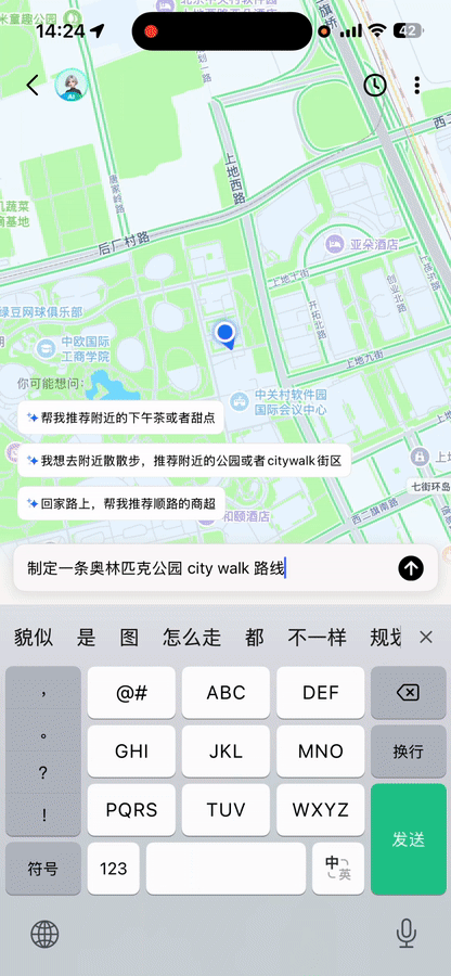 再比如,假设想去奥森 Citywalk,高德 AI 瞬间就能制定出三种攻略。