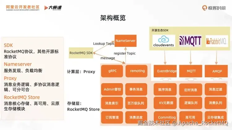 这是 RocketMQ 5.0 的架构概览图,从上往下看,可分为 SDK、NameServer、Proxy 和 Store 层。