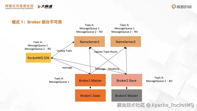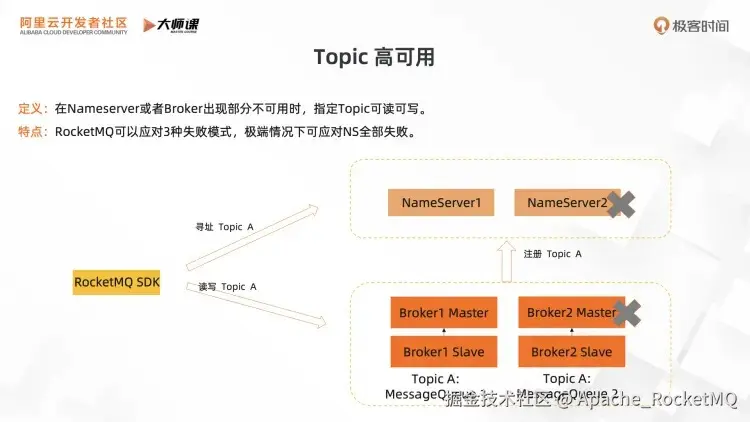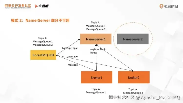 接下来,再看 NameServer 集群的故障情况,由于 NameServer 是 ShareNothing 的架构,每个节点都是无状态的,并且是 AP 模式,不需要依赖多数派算法,所以只要有一台 NameServer 存活,整个服务发现机制都是正常的,Topic 的读写可用性不受影响。