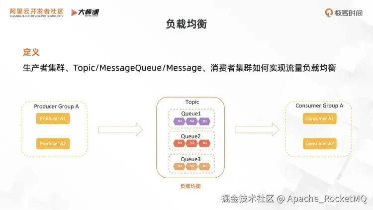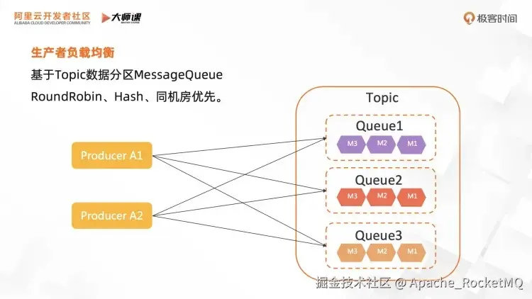 刚才我们已经知道 SDK 如何通过 NameServer 来发现 Topic 的分片信息 MessageQueue,以及 Broker 地址。基于这些服务发现的元数据,我们再来详细看看消息流量是如何在生产者、RocketMQ Broker 和消费者集群进行负载均衡的。