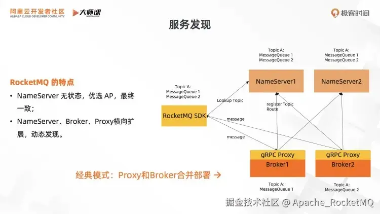 在示例中 Broker1 和 Broker2 分别承载 TopicA 的一个分片。在 NS 机器上会维护全局视图,TopicA 有两个分片分别在 Broker1 和 Broker2 。RocketMQ SDK 在对 TopicA 进行正式的消息收发之前,它会随机访问一个 NameServer 机器,从而知道这个 TopicA 有哪些分片,每个数据的分片在哪个 Broker 上面,它会跟这些 Broker 建立好长连接,然后再进行消息的收发。大部分的项目的服务发现机制会通过 zookeeper 或者 etcd 等强一致的分布式协调组件来担任注册中心的角色,而 RocketMQ 有自己的特点,如果从 CAP 的角度来看,它的注册中心采用的是 AP 的模式,NameServer 节点无状态,是 ShareNothing 的架构,有更高的可用性。