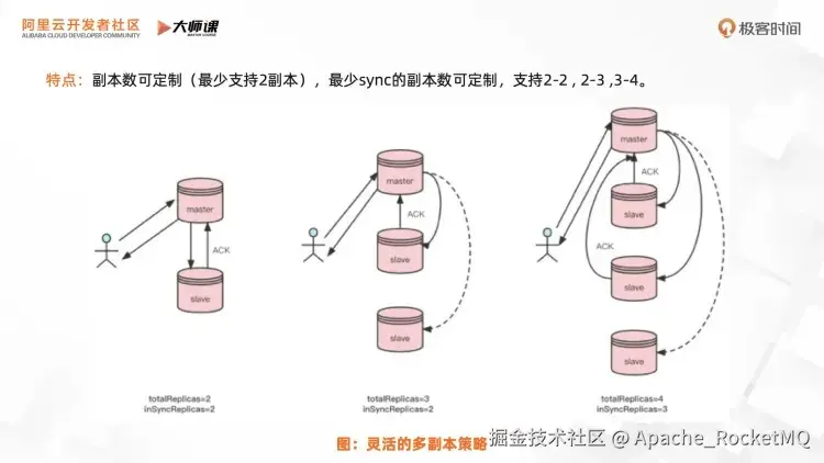 四是可定制,用户可以根据业务对数据可靠性、性能、成本综合选择,比如副本数可以是2、3、4、5,副本直接可以是同步复制、异步复制。如 2-2 模式表示,2 副本、并且数据同步复制;2-3 模式表示3副本,2副本多数派完成复制,才算成功。用户还可以将其中的一个副本部署在异地机房,异步复制实现容灾。