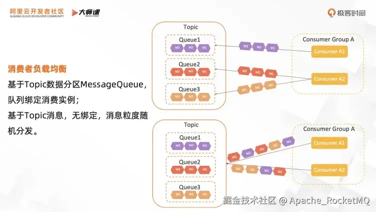 再看消费者的负载均衡,相对来说会比生产者更复杂,它有两种类型的负载均衡方式。最经典的模式是队列级负载均衡,消费者知道 Topic 的队列总数,也知道同一个 Consumer Group 下的实例数,就可以按照统一的分配算法,类似一致性 hash 的方式,让每个消费者实例绑定对应的队列,只消费绑定队列的消息,每个队列的消息也只会被一个消费者实例消费。